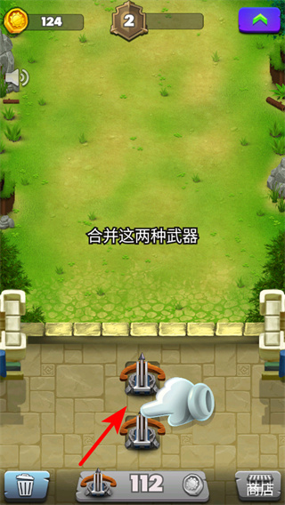 3、紧跟红色箭头指引,将两个相同类型的武器拖拽合并,升级更高阶武器,提升能力。