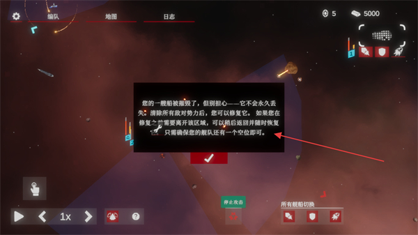2、遇到舰船被摧毁的提示时,点击对勾确认提示,了解舰船恢复规则清理敌方后可复活。