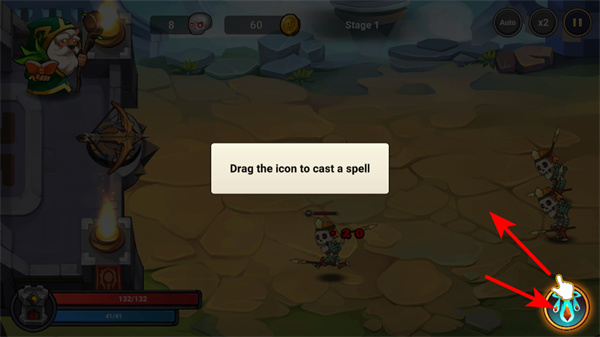 3、战斗中拖动法术图标释放法术,可对敌人如骷髅兵造成大量伤害,释放时需瞄准敌人密集区域,最大化法术效果。