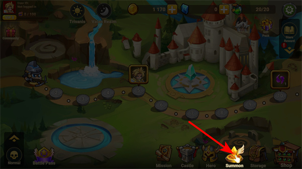 1、游戏中点击Summon按钮,可召唤英雄增强战力,这是组建阵容的关键操作,需关注英雄的属性和自身资源情况。