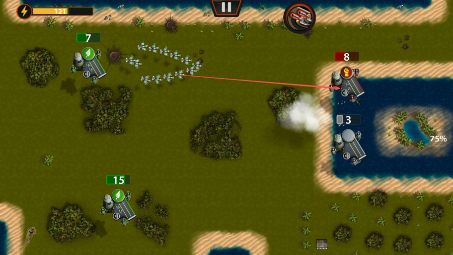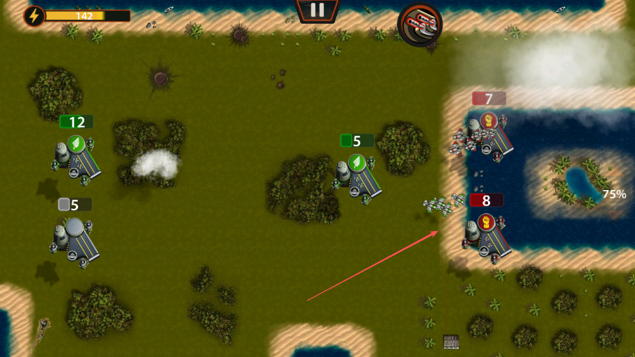 2、按箭头方向,从我方机场派遣飞机攻击敌方机场,减少敌方机场飞机数量12变为8。