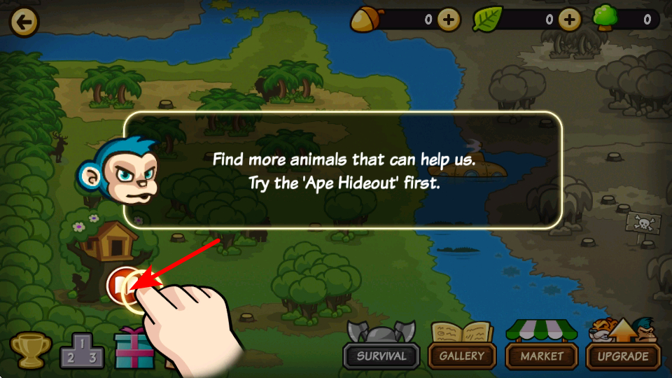1、进入游戏后,点击红色箭头指向的按钮,可前往Ape Hideout区域,这是推进游戏剧情、寻找助力动物的关键操作。