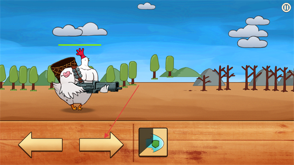 2、当前是关卡挑战界面,通过底部左右箭头操控持枪鸡移动,点击右侧技能图标释放技能,推进关卡进程。