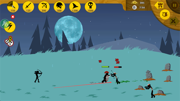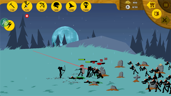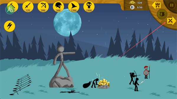 3、指挥士兵与敌方火柴人战斗,弓箭手远程攻击,近战士兵冲锋陷阵,消灭敌人。