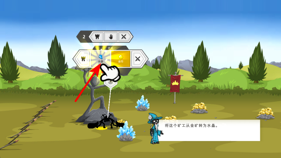 3、根据指引点击水晶选项,将矿工从金矿转为水晶矿,这是切换资源采集类型的操作,助力获取对应资源。
