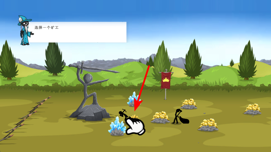 2、游戏中依照提示点击矿工,选择对应矿工角色,这是完成资源采集准备的操作,点击后矿工将进入工作状态。