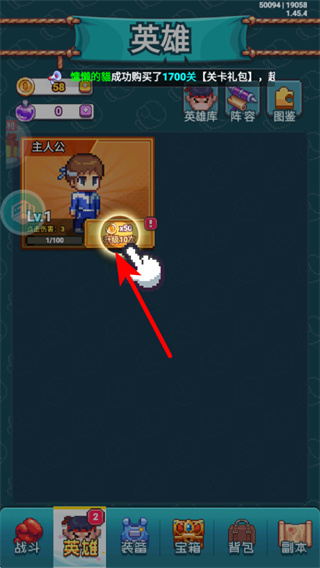 4、在英雄界面中,点击角色对应的升级按钮,消耗资源提升角色等级如等级1升2,增强战力属性,提升输出能力。