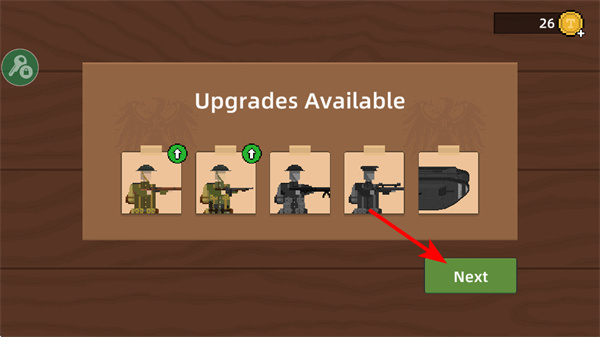 2、点Next按钮查看升级选项,升级操作是强化士兵战力的核心步骤,选择合适的升级可提升军队的攻击能力。