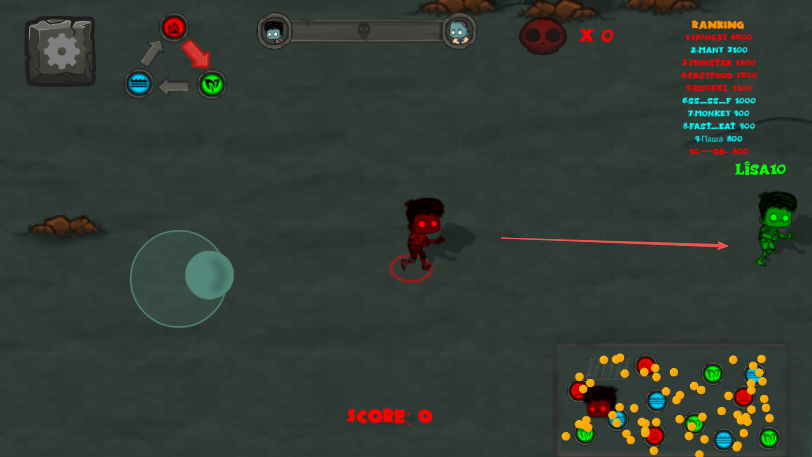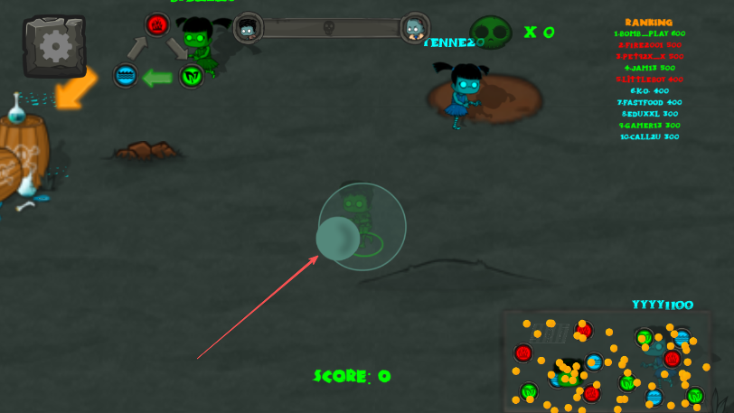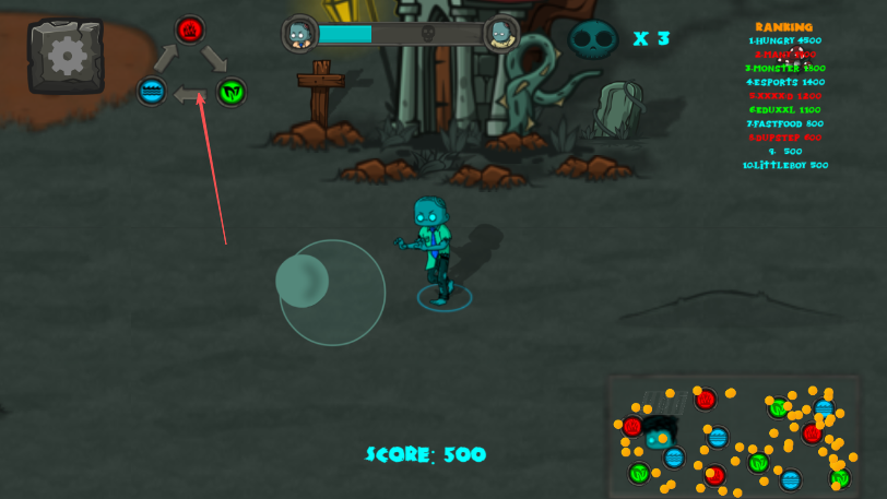 1、进入游戏,通过屏幕上的虚拟摇杆箭头所指透明圆圈操控绿色僵尸移动。