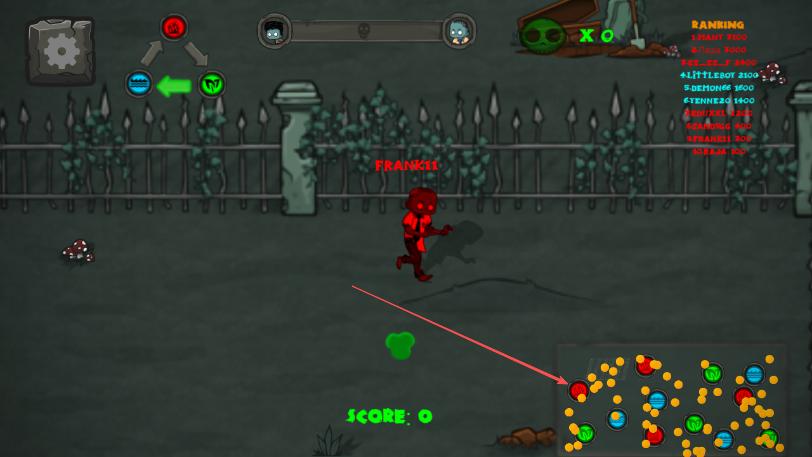 3、遇到其他颜色僵尸如红色僵尸,操控角色攻击对方,获取分数。