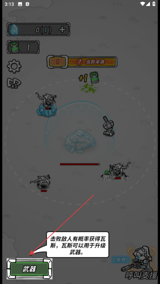 3、战斗中击败敌人有概率获取瓦斯点击武器按钮用瓦斯升级武器提升战斗力。