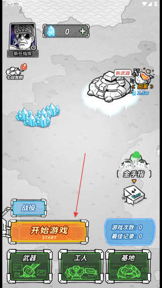 1、进入游戏界面查看新任指挥身份及0资源数量点击开始游戏按钮开启游戏。