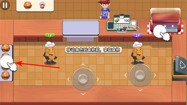 2、移动角色到食物前,点击对应食物区域可拿取食物,操作才能为制作餐品提供原料。