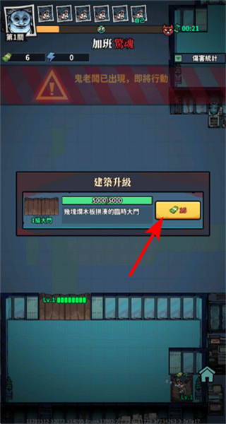 3、按照箭头指引,在建筑升级界面点击对应的资源按钮,消耗资源提升大门等级,增强防御能力。
