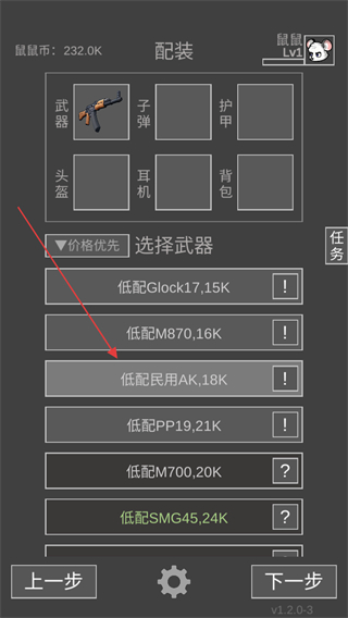 2、在下方列表栏中选择需要带进对局中的武器枪械,可以根据战备值进行选择。