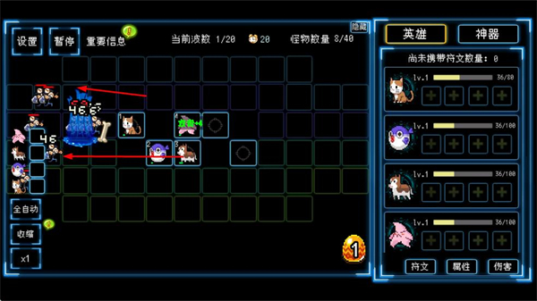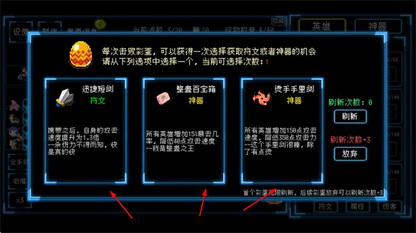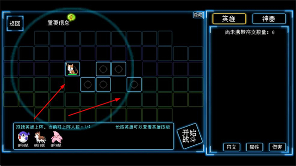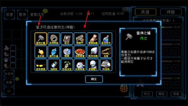 3、战斗间隙可选择符文/神器,配置增益道具,增强英雄的战斗能力,提升关卡通关效率。