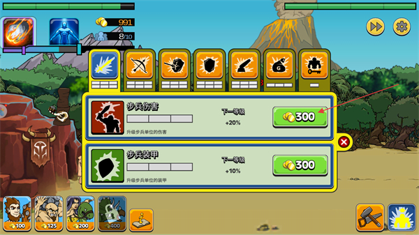 4、战斗获取资源后打开升级界面,选择步兵伤害或步兵装甲,消耗300金币进行升级,提升步兵战力以助力后续的战斗进程。