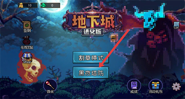 1、打开地下城进化版游戏,在主界面点击黑夜塔防模式进行游玩。