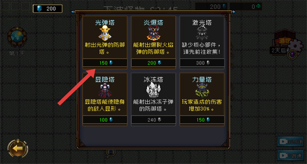 3、在防御塔选择界面,选择合适的防御塔消耗对应的资源,进行建造。