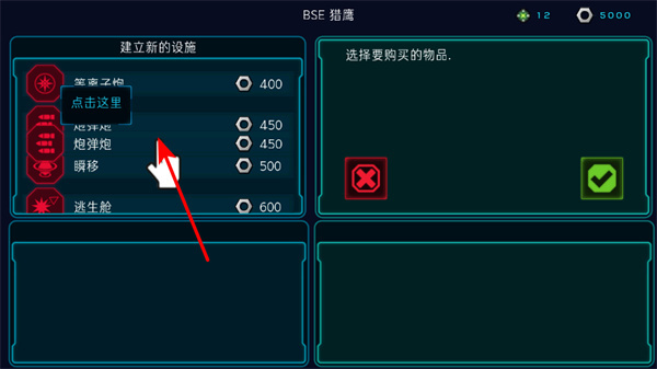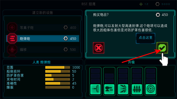 1、进入设施购买界面后,点击炮弹炮等设施选项,这是提升飞船战力的关键操作,可选择需购买的设施类型。