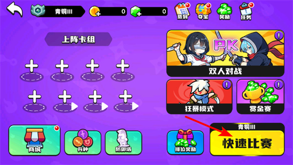 1、选择对战模式,模式选择是开启卡牌对战的关键操作,选择后可进入双人对战、狂暴模式玩法,开启对决之旅。