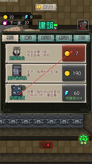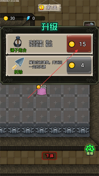 4、金币足够的情况下,优先升级大门、床铺和炮台,点击建筑信息内的金币按钮进行升级。