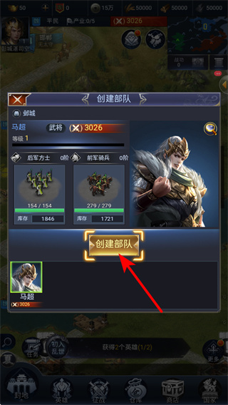 3、在创建部队界面,选择武将如马超并搭配对应兵种盾斧方士,点击创建部队可完成军队编组,这是发起征战、攻占领地的前置准备。