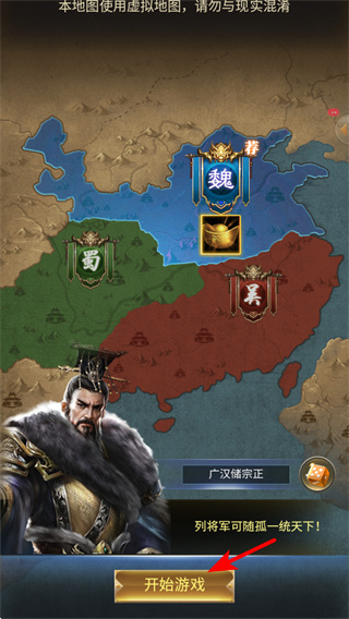 1、在游戏启动界面,点击开始游戏按钮可进入三国题材的策略玩法,这是开启势力发展、领地扩张的基础操作,通过招募武将推进统一进程。