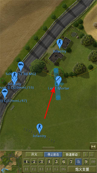 2、遇到Light Mortar单位时,点击该单位并部署至战略点位,迫击炮可提供远程火力支援,部署时优先选择能覆盖敌方路径的区域。