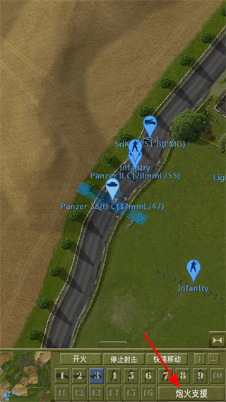 1、进入战斗界面后,点击炮火支援按钮,这是发起火力压制的关键操作,准确点击可对敌方区域实施炮火覆盖,削弱敌方战力。