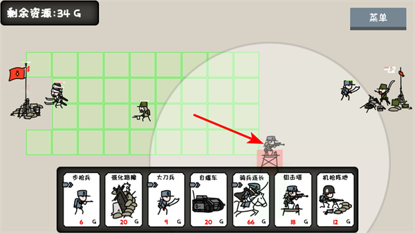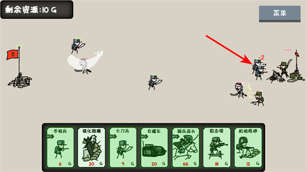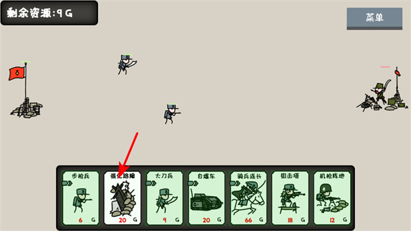 4、战斗中关注剩余资源,合理搭配步枪兵、强化路障等单位,利用步枪兵的移动性突袭敌方核心,强化路障的防御性守护旗帜。
