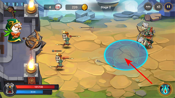 1、战斗中利用法术对敌人如骷髅兵造成大量伤害,积累金币资源,战斗时需优先攻击敌人以获取更多金币。
