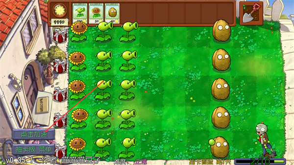 2、这是抽卡冒险关卡内界面,种植向日葵收集阳光,再种豌豆射手攻击僵尸、坚果阻挡,点击加速可加快进程。