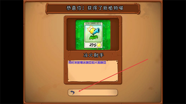 4、抽取卡牌获得新植物冰火射手,它可同时发射寒冰豌豆和火焰豌豆,点击界面下方按钮关闭弹窗,该植物会加入植物栏,后续可消耗阳光种植它增强战力。