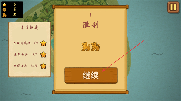 4、这是关卡胜利的结算界面,左侧显示本关挑战目标已全部达成并获得了两枚虎符,点击继续按钮即可结束当前关卡,进入后续游戏环节。