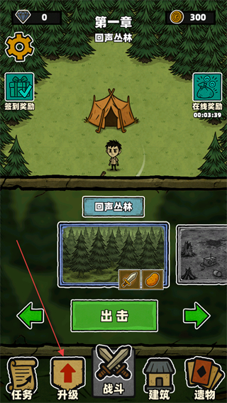1、进入第一章回声丛林界面,可点击签到奖励、在线奖励领取奖励,点底部升级选项后,即可进入角色升级页面。