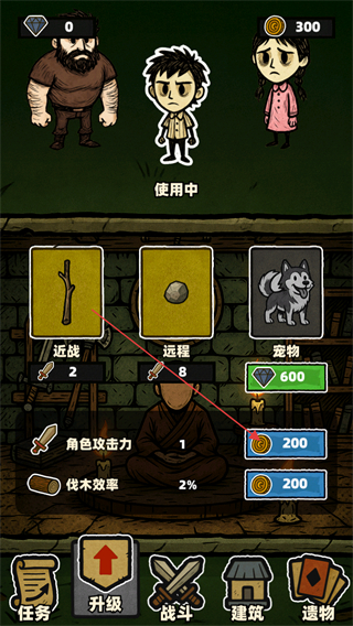 2、在本界面选近战、远程配置,可耗资源进行升级,提升角色攻击力与伐木效率,完成升级后即可出击进入游戏。