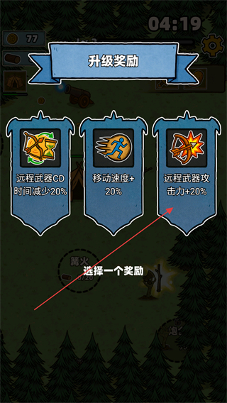 4、升级后弹出升级奖励界面,从三个选项中选其一,如远程武器攻击力+20%,选定后获对应属性加成助战斗。
