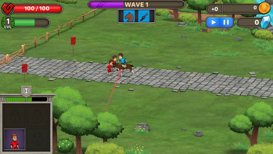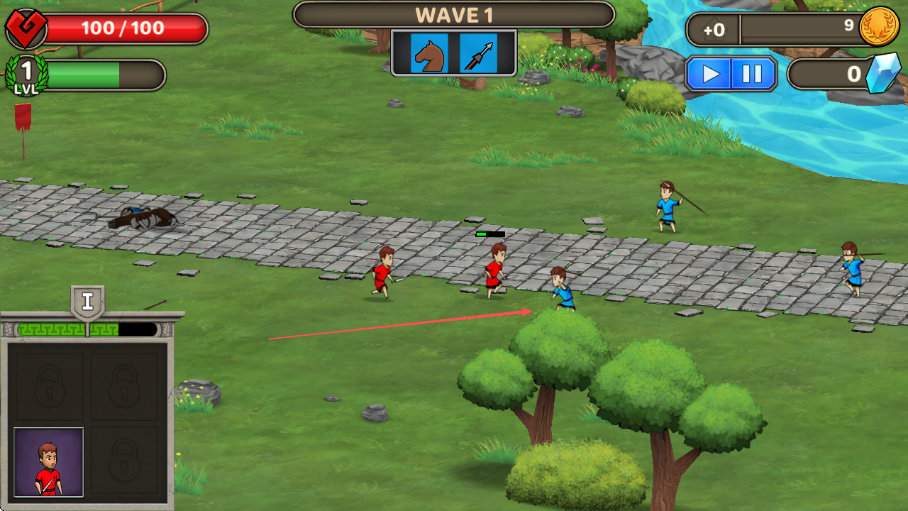 1、进入游戏按箭头指引,操控红方士兵攻击蓝方骑马敌人,抵御第一波进攻。