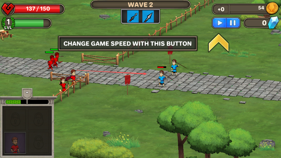4、按照箭头提示,利用上方按钮调整游戏速度,指挥红方士兵攻击蓝方敌人,推进关卡进程。