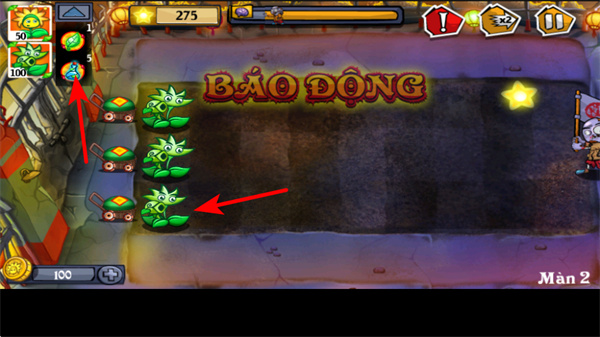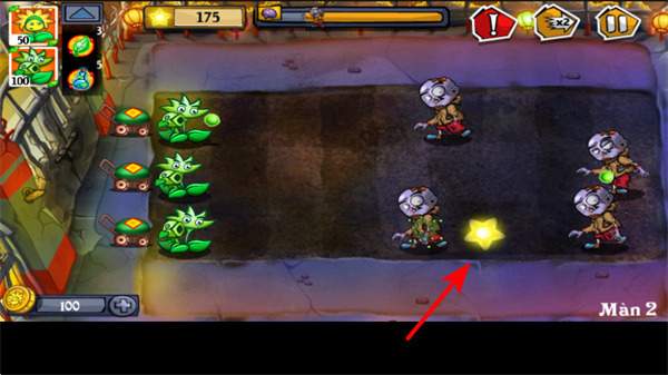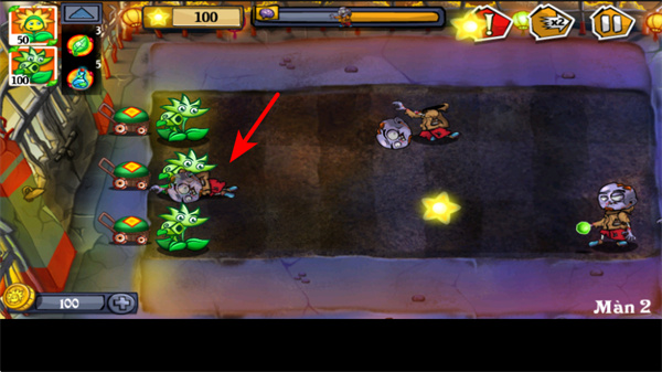 2、游戏中依照箭头指引布置植物,让植物攻击靠近的僵尸,这是防御僵尸的基础操作,按此布置可阻挡僵尸前进。
