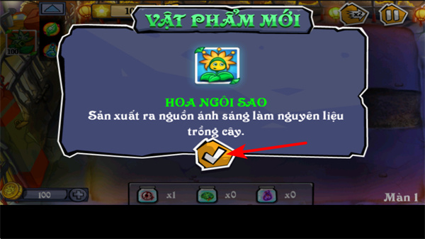 1、获取新道具后点击对勾按钮,确认解锁HOANG SAO,这是获取资源植物的操作,该植物可产出种植所需资源。