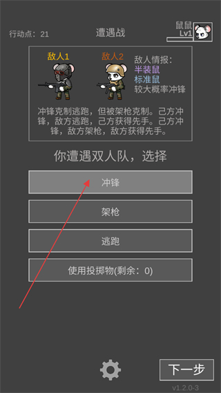 1、当对局内遇到遭遇战时,可以做出选择是冲锋、架枪还是逃跑。