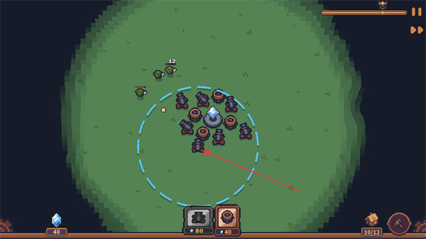 3、在晶石周围布置建筑设施,借助这些建筑抵御兽人,注意设施的攻击范围只有篮圈位置,我们需要保障晶石资源安全推进关卡。