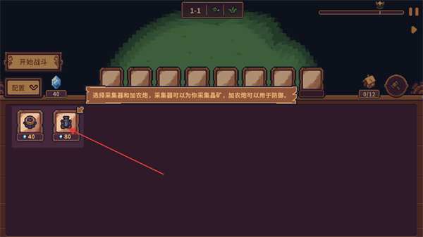1、在该界面选择采集器和炮塔,采集器可帮你收集矿产,炮塔用于防御,选好对应设施后准备开启战斗。
