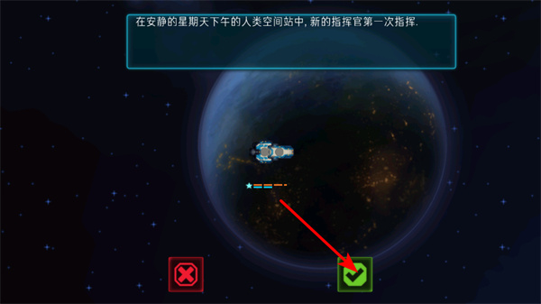 2、在太空指挥场景中,点击绿色对勾按钮,这是确认指挥指令的核心步骤,准确点击可推进剧情,开启首次太空任务。