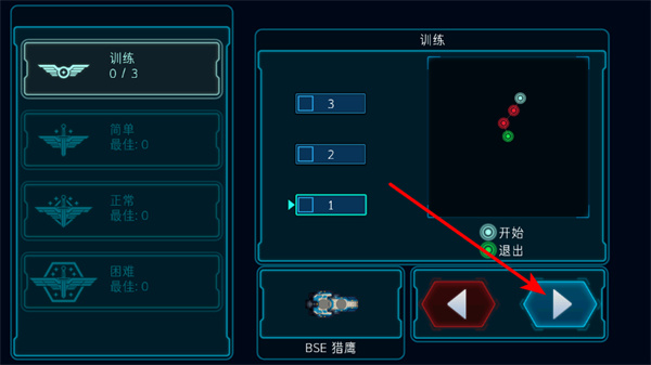 1、进入训练界面后,点击右侧蓝色箭头按钮,这是选择训练模式的关键操作,切换不同训练难度,开启技能养成环节。