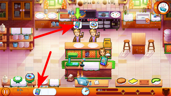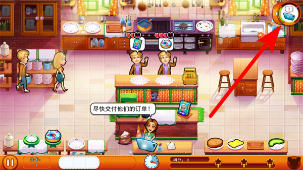 4、处理完当前订单后,点击右上角按钮查看进度,继续推进后续游戏流程。