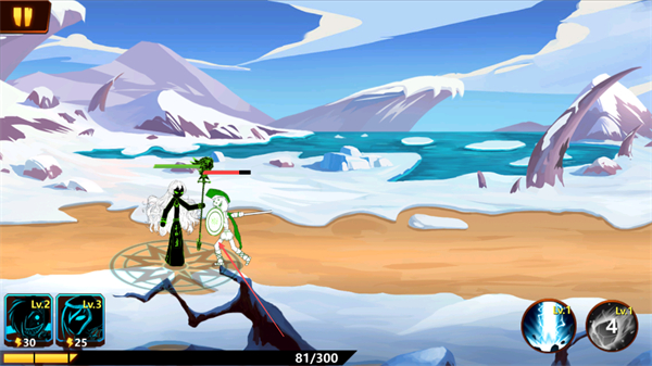 1、操控火柴人角色与敌方绿色持盾单位战斗,注意观察双方血量,把握攻击时机。