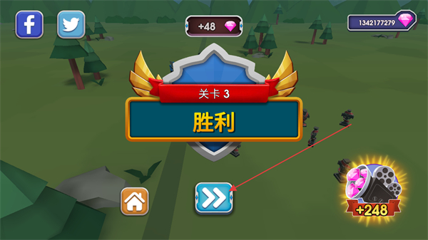 4、界面显示关卡3胜利,点击箭头进入下一关,获取+48钻石等奖励。